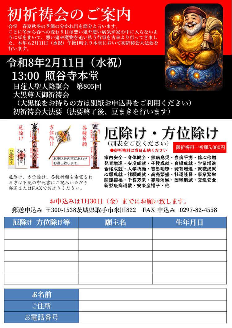 令和8年2月11日(水祝)初祈祷会を行ないます。どなたでもお申込み、ご参加可能です。節の変わりにあわせた「厄除け初祈祷会」となります。令和4年厄除けの方、また諸願成就を希望する方の御祈祷を行ないます。どなたでもお申込み可能です。(檀信徒以外、お申込みはお電話にて受付致します)